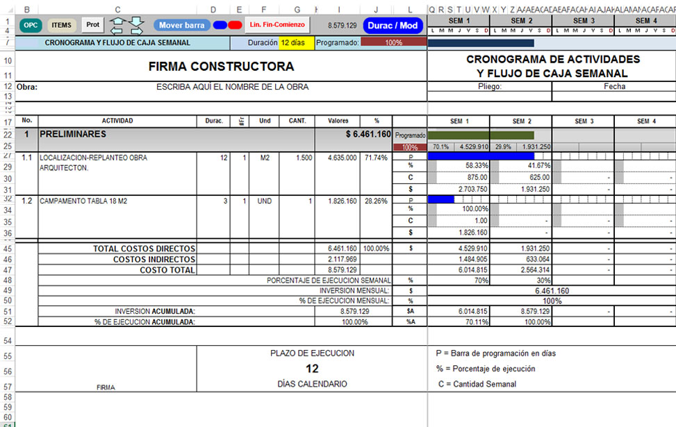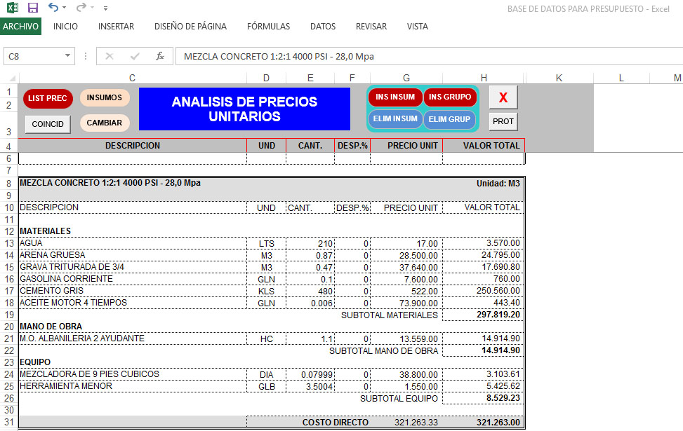 Resumen total de insumos a utilizar (Materiales, M.O. Equipo).